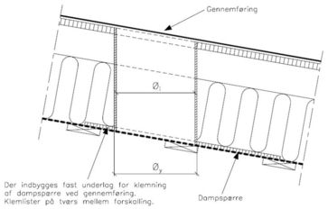 Den tredje type er indbygning af fast underlag, fx. krydsfinerplade, lige over dampspærre, hvor loftsbeklædning er placeret direkte mod isoleringen. Dette område kunne for eksempel være mellem to gennemgående ribber, hvorefter en gennemføring vil kunne udbores på byggepladsen. Hullet bores så tæt og dog så stort, at der efter montering af gennemføring kan fuges helt tæt imellem gennemføring og dampspærre. Som det ses af fig. 2, kan fast underlag også anvendes, hvor der er indbygget forskalling. I denne situation skal det sikres, at der udføres klemlister rundt om gennemføring.